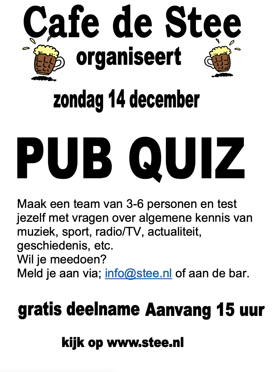 Vul dit formulier in om je in te schrijven. Je ontvangt dan 1x per maand van ons een e-mail met informatie over de activiteiten in De Stee.