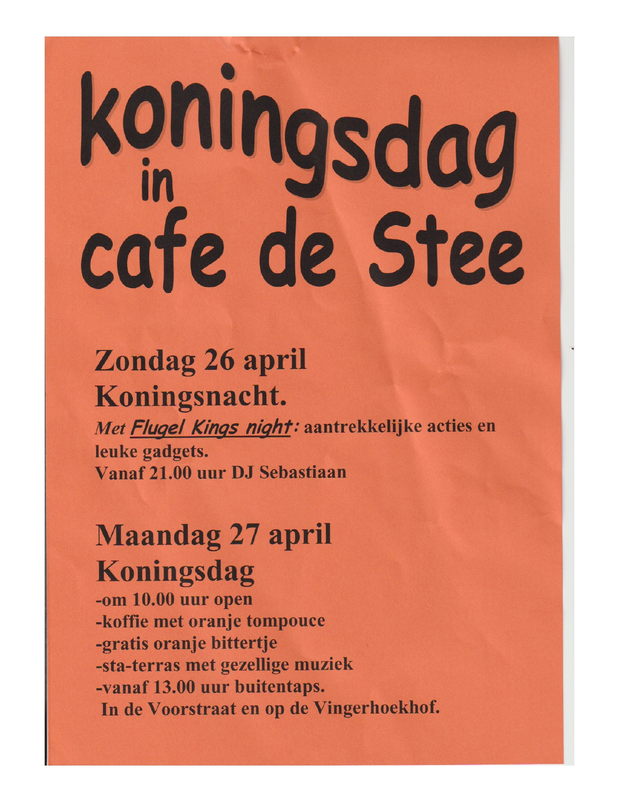 Zondag 26 april Koningsnacht en maandag 27 april Koningsdag ben je van harte welkom bij Cafe de Stee.